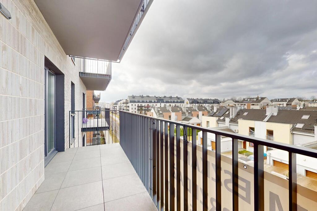 Balkon o komfortowych wymiarach – mieści stolik i fotele ogrodowe. Widok na niską zabudowę szeregową zapewnia większą prywatność i poczucie przestrzeni.