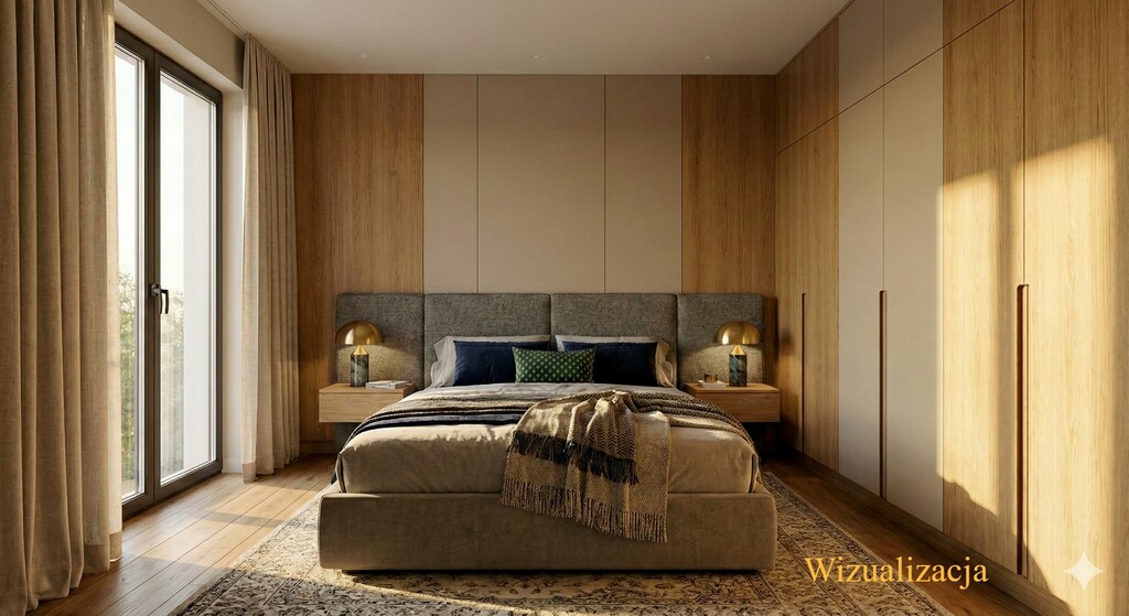Oddzielna sypialnia z miejscem na duże łóżko, stoliki nocne oraz pojemną szafę. Ciche pomieszczenie, idealne jako prywatna strefa wypoczynku.
