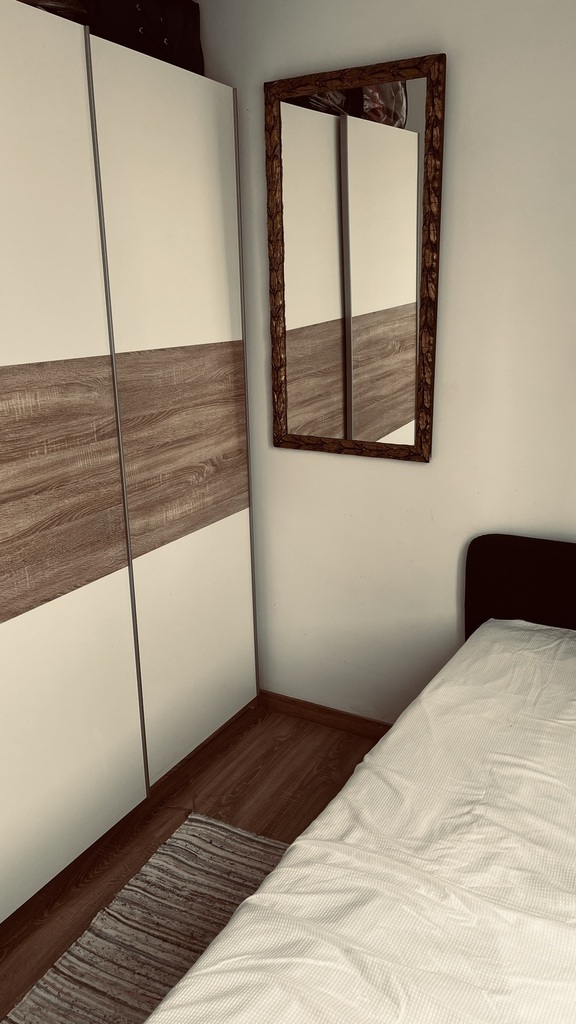 - sypialnia – wygodne łóżko, duża szafa z drzwiami przesuwnymi + dodatkowe schowki nad drzwiami