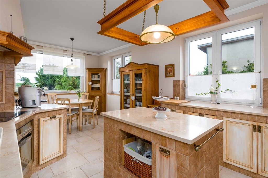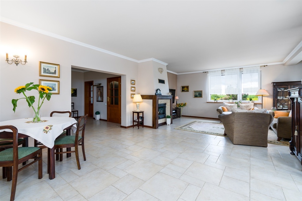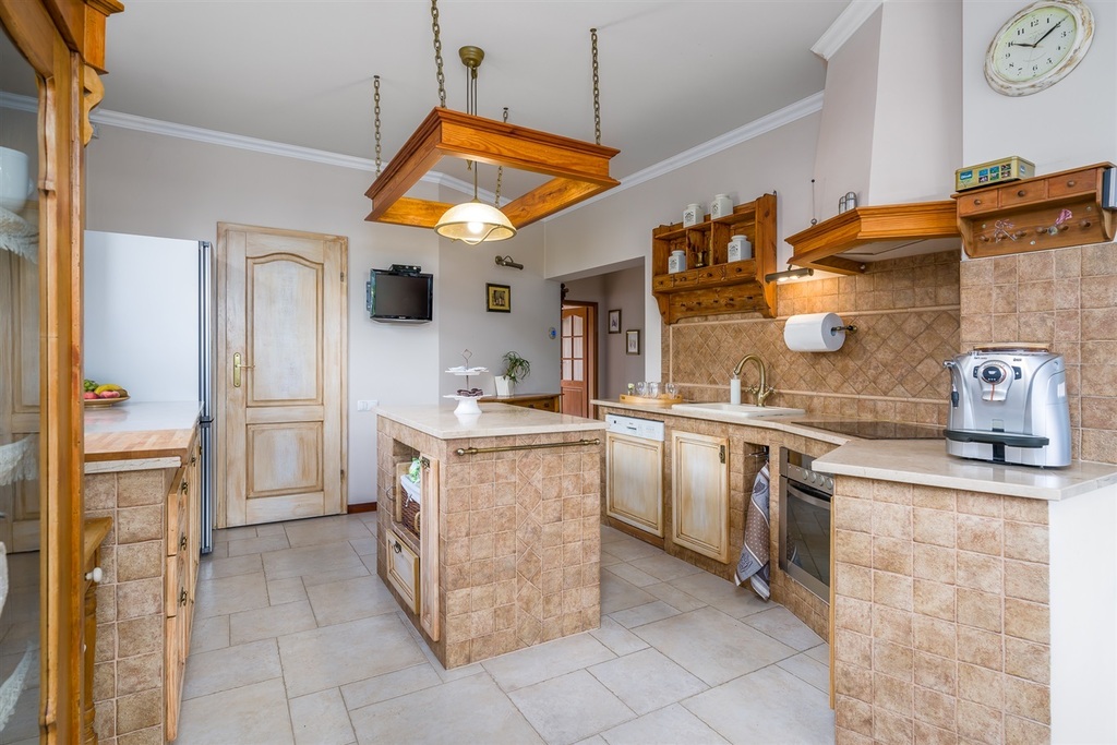 W salonie znajduje się kominek z płaszczem wodnym umożliwiającym ogrzewanie całego domu. Kuchnia (meble pokryte blatem marmurowym Crema Marfil). Do kuchni przylega spiżarnia.