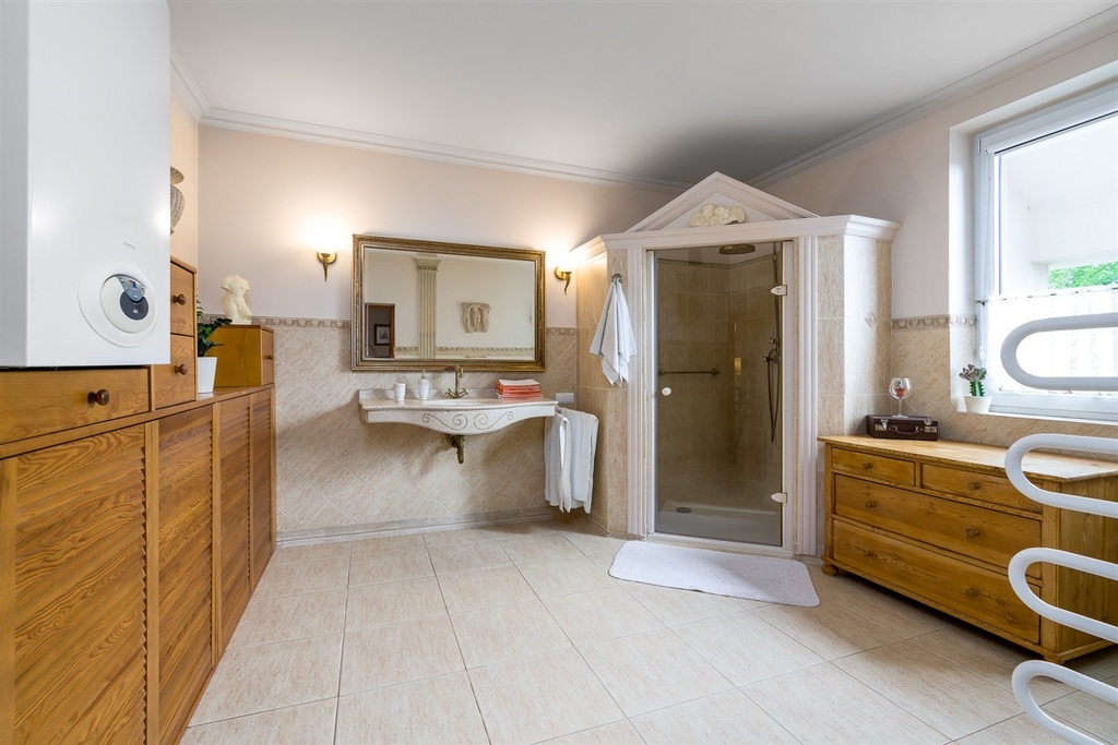 O tym, że nieruchomość jest nieruchomością luksusową, niech zaświadczy chociażby fakt, że w łazience zamontowana została wanna narożnikowa z hydromasażem firmy Ruben system Rexus Le monde – system wodno-powietrzny z dyszami shiatsu. Sterowanie elektroniczne (sinusoidalne, pulsacyjne z możliwością zmiany natężenia) wyświetlacz temperatury wody i czasu kąpieli, osuszanie, podgrzewane powietrze. Zainstalowana chromoterapia (9 kolorów).