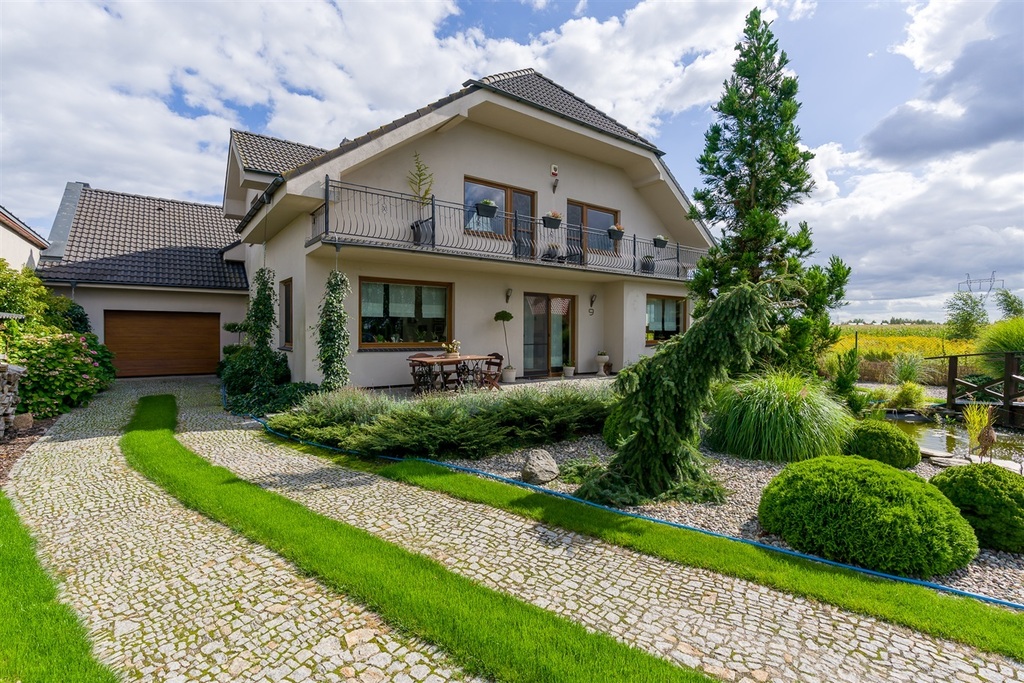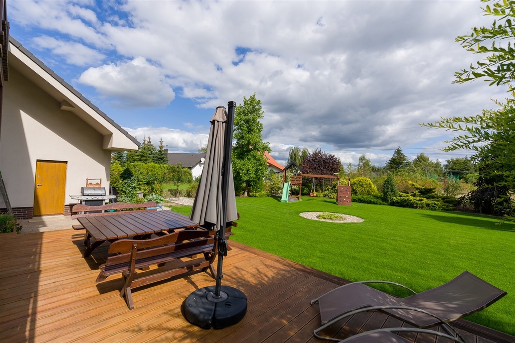 Kolejnym atutem domu jest pięknie zagospodarowany ogród zarówno od frontu jak i z tyłu budynku. Całość terenów zielonych zaopatrzona jest w system automatycznego nawadniania (własna studnia i pojemniki na wodę deszczową). W przedniej części działki znajduje się zarybione oczko wodne wielkości 30m2 z mostkiem drewnianym. Na terenie całego ogrodu poza piękną trawą  (pod trawą specjalna siatka ochronna) znajdują się liczne nasadzenia roślin, krzewów i drzew również nawadniane. Na terenie działki znajdują się trzy miejsca parkingowe na ogrodzonym terenie wyłożonym łupkiem granitowym oraz 1 miejsce postojowe w dużym garażu wyłożonym płytkami gresowymi szkliwionymi. Częścią składową działki jest również parking przed posesją dla sześciu samochodów wyłożony kostką betonową.
